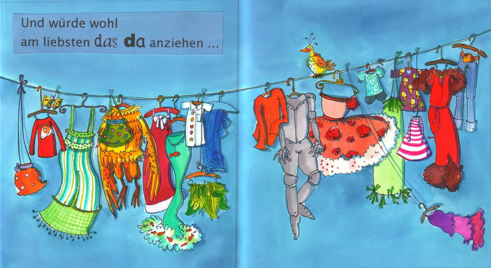 Ahhh, ich würde wohl am liebsten das Federkleid mit den Füßen dran tragen! Und dann auf das fertige Bilderbuch warten, um es meiner Bilderbuchsammlung (!) einzuverleiben!!! …oder doch lieber das Blätterröckchen????