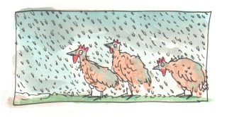 Regen ist besser als Schnee, finden die Hühner.
