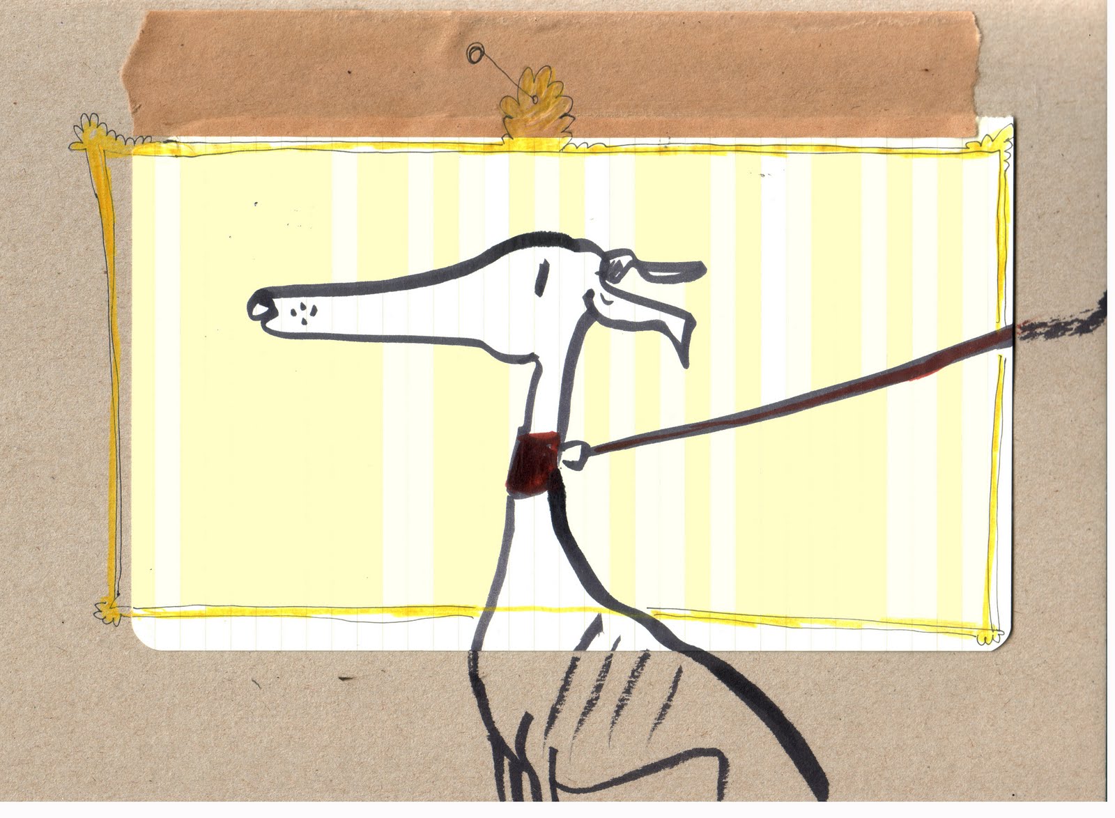 Windhund auf Streifenpapier auf Pappe mit Klebeband befestigtund noch ein Rahmen drum.Di-del-dum.