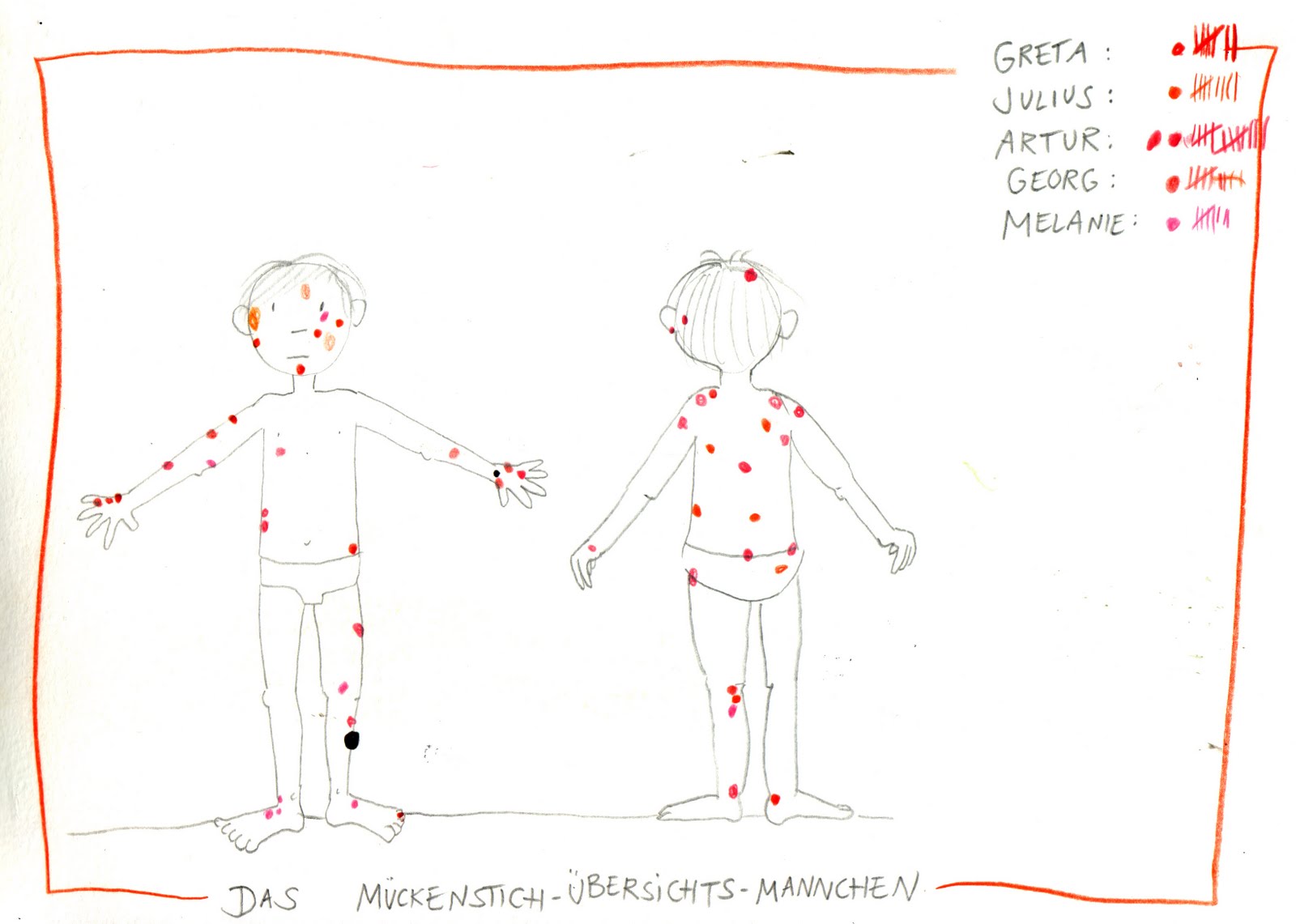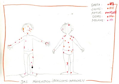 Das haben wir nur am Anfang gemacht, unsere Mückenstiche dokumentiert.