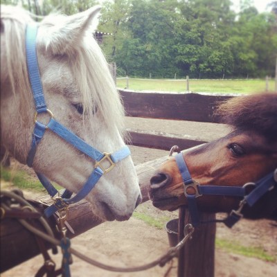 Ich kann das darauf folgende Quietschen schon hören…tja, Stuten sind da eben erst mal vorsichtig mit so neuen Herrenbekanntschaften. Sind aber beides echt schnuckelige Pferdchen (darf ich auf keinen Fall meiner Tochter zeigen, sonst nervt sie noch mehr, dass sie ein eigenes Pony will).