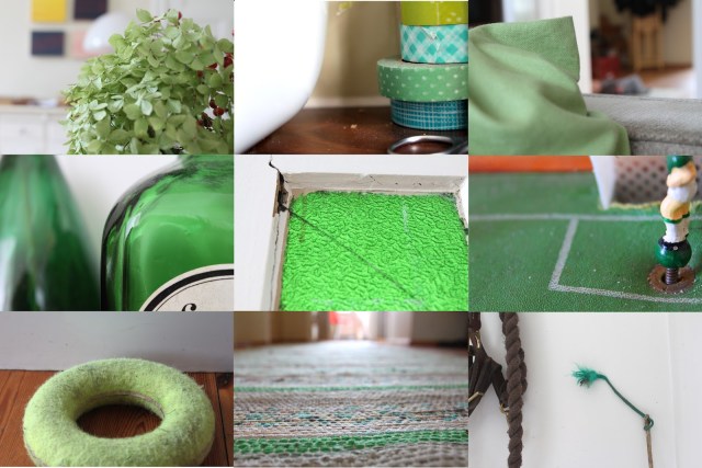 1-Angelpose steckt in grüner Vase, schon länger, keiner weiss warum. 2-grüner Strauss auf dem Esstisch. 3-muss mal die Maskingtapes endlich aus der Küche räumen. 4-grünes Sofakissen, im Flur liegt ein Baby rum! 5-grüne Vase in der Grüne-Vasensammlung. 6-Türfensterglas 7-Fussballspiel mit Krümeln drauf. 8-Ferdinands Lieblingsspielzeug, so ein deformiertes Tennisballding. 9-grüner Flickenteppich aus Schweden. 10-grüne Spitze meiner Lieblingsgerte neben dem Halfter.