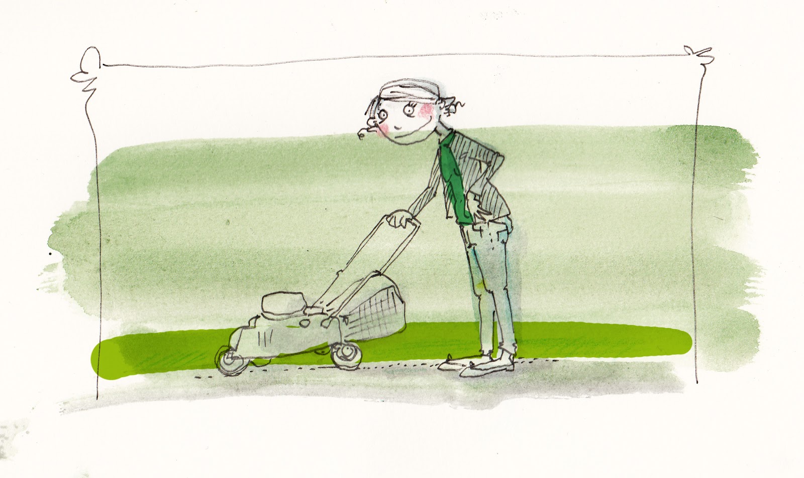 ich mag den rasenmäher – und den strahleblick; cooles rasenmähoutfit übrigens. grüngrüngrün.