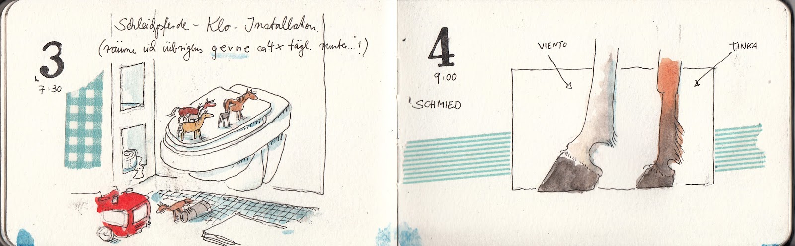 Herrlich! Die Pferdeinstallation steht ganz genauso bei uns. Wahlweise auch im Waschbecken, dann aber mit Wasser, das keinesfalls gar nie nicht abgelassen werden darf :-)