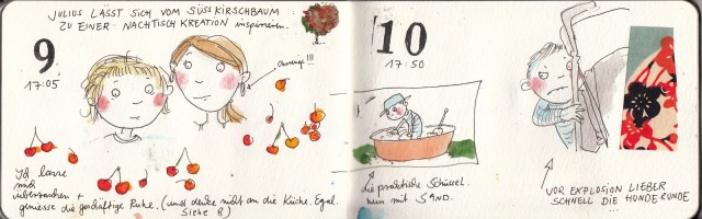 Wunderschön so bunt! Das Katermädchen ist reizend, und die Kirschen und die Früchte und du im Garten… Ich finde es klasse und zeichne jetzt schnell weiter, ich hab erst zehn von zwölf ;)