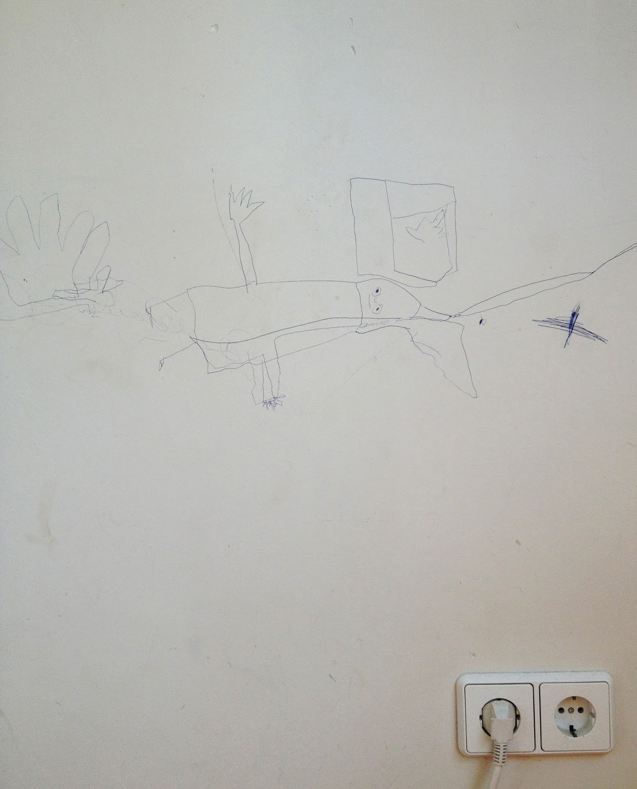 Och. Schade. Wird man von Julius in 10.000 Jahren also keine Höhlenmalerei bewundern können. Vielleicht lässt Du von dem Foto einfach ein Tapetenmuster herstellen für sein neues Zimmer? Naja, ich bin sicher, es folgen neue Wandmalereien…nehmt also eine Wandfarbe, auf der sie sich gut machen werden!