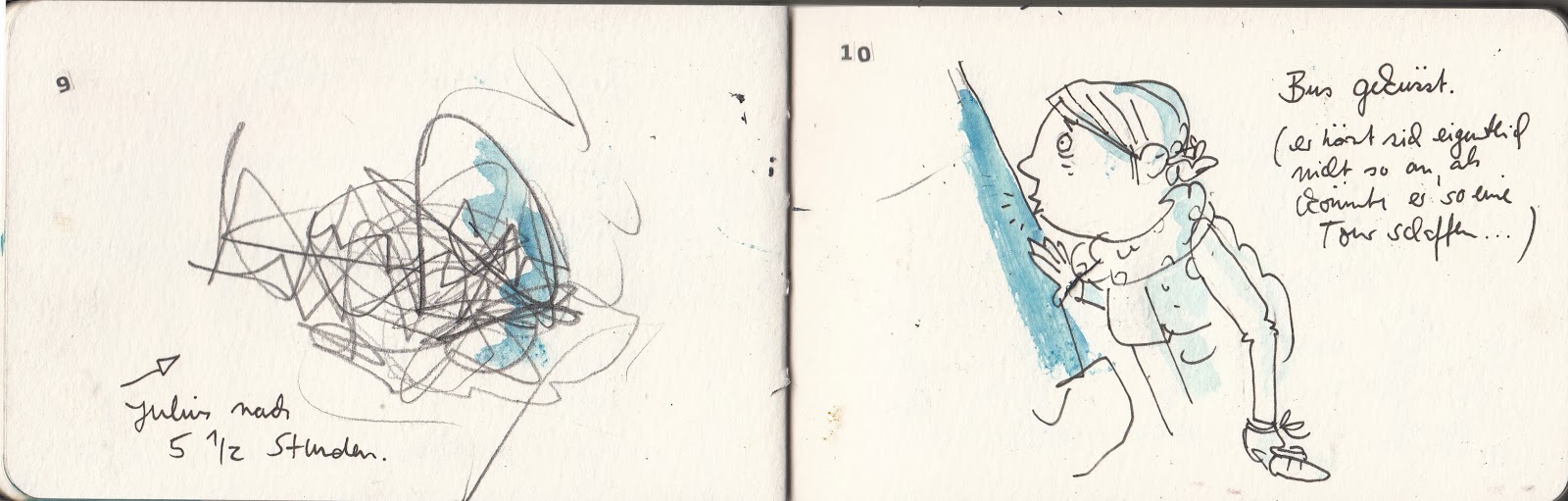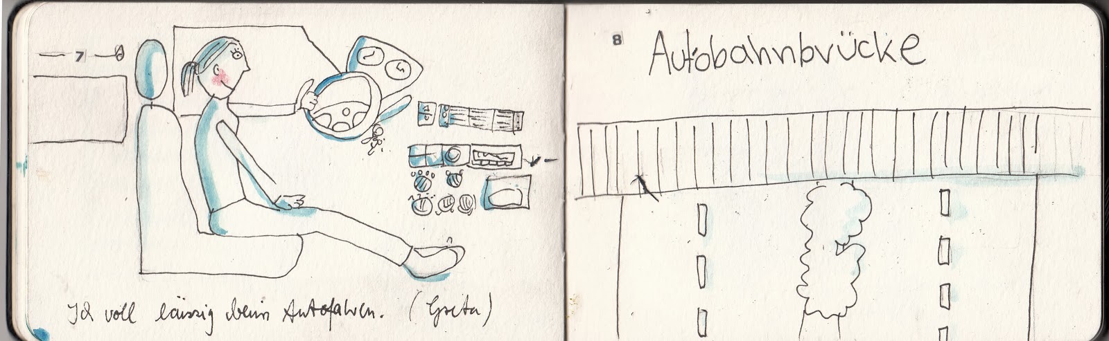 wow, bin begeistert, vom Schloß, vom genialen Autobahn-Schilderwald, Bälle für den kleinen Bruder, ein Blick auf die Fahrerin im Cockpit da wäre ich ja komplett verzweifelt Greta wahnsinnig gut gezeichnet! Autobahnbrücke, ha einfach gut.Und die Fahrerin nach 600 lässigen Kilometern hihi mit dem perfekt geschnürten Finger.