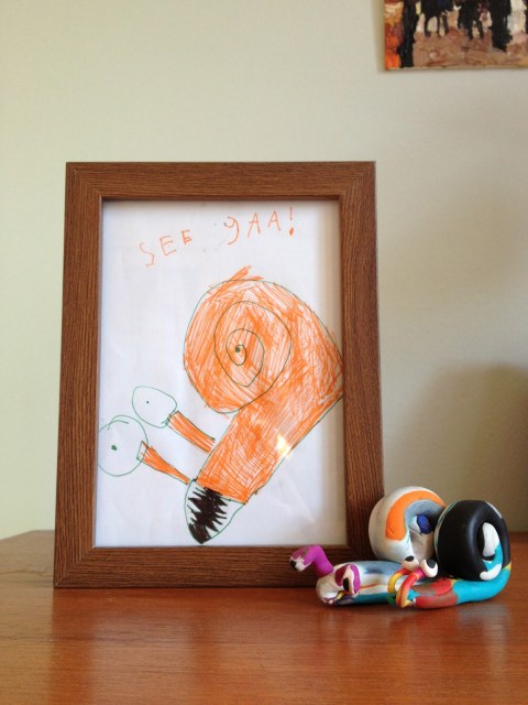 Und weil es so gut zu seinen Fimoschnecken passt, sofort gerahmt.
