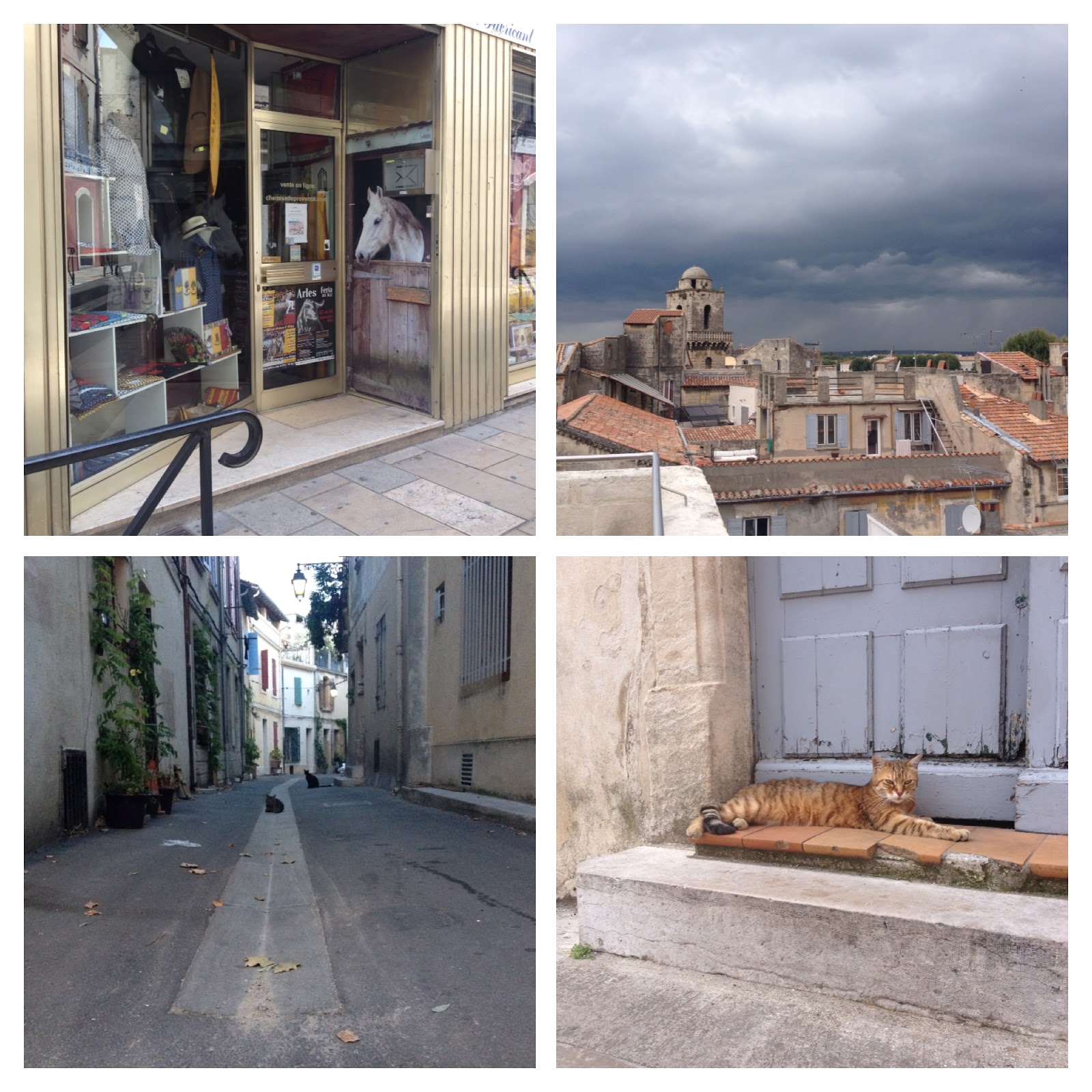 1 Schaufenster.   2 Gewitter über den Dächern.   3 Katzengasse.   4 noch ne Katze.Und eine schöne Tür.