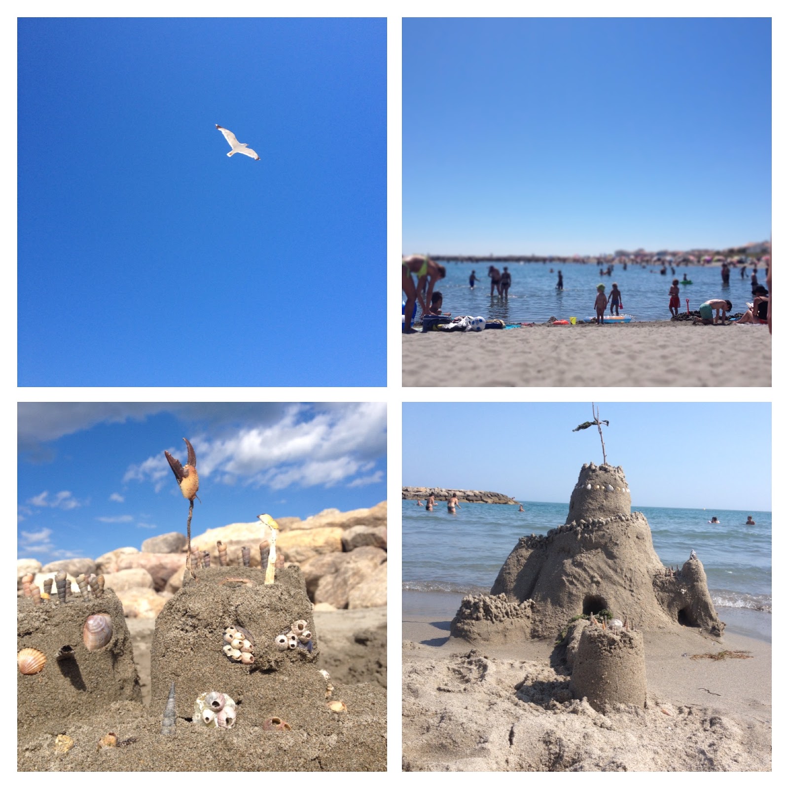 1 blauer Himmel.   2 buddeln, baden, gucken.   3 Sandburg Goldene Krabbe.   4 Sandburg Deluxe.