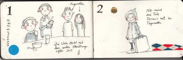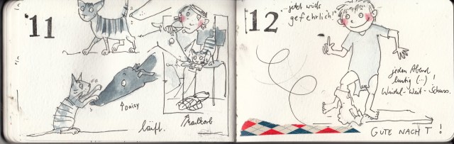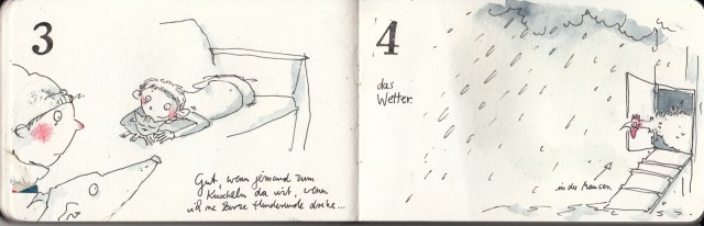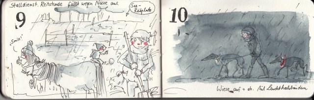 Hach, wieder so wunderbare 12 von 12-Illustrationen. Und diesmal konnte ich bestens mitempfinden: auch unsere Hühner kämpfen zur Zeit überwiegend nackt gegen Regen und Sturm, unser Pferdchen hat zwar sein Winterfell noch, ist vom Wetter aber gar nicht angetan, vom Reiten noch viel weniger und die Weiden sind zur Zeit eher Kneipp-Becken und daher bleibt nur der sehnsüchtige Blick vom Paddock auf das ehemalige Grün. Und unser neues, gerettetes Katzenteufelchen verpaßt ebenfalls keine Gelegenheit sein Autogramm in die zarte Hundenase einzugravieren. Nur aus dem Alter des Windelweitschusses sind meine beiden (Gott sei Dank) schon eine Weile raus.