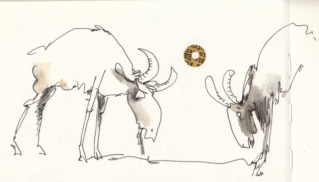 Zwei Böcke, die mit einem bedruckten Bagel Kopfball spielen, wobei der linke Bock so aussieht, als ob er keinen Bock mehr hat… sehr schön!