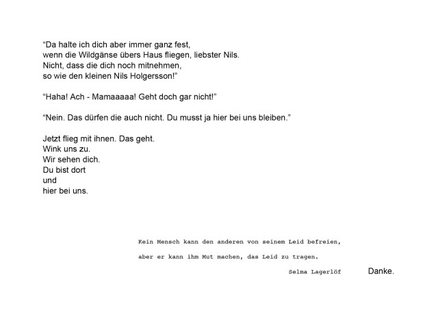4. […] Zitat. Oh, wie ich es immer noch liebe. Ich hatte es ans Ende unserer Trauerkarte gesetzt. Und es trägt fort und fort, liebe Selma. Danke […]